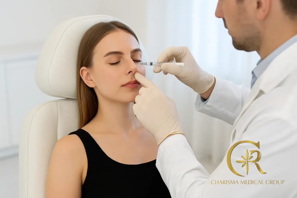 - الاستشارة الأولية: يلتقي بكِ الطبيب المتخصص لتقييم شكل أنفكِ، فهم توقعاتكِ، وتحديد نقاط الحقن المناسبة.