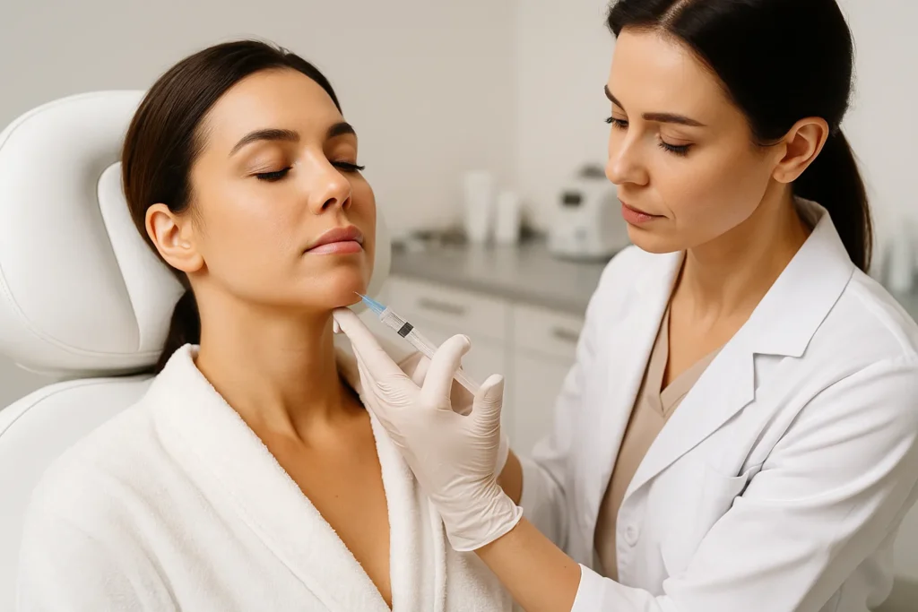 - التطهير والتخدير: يتم تطهير منطقة الذقن وتطبيق كريم تخدير موضعي لضمان راحتكِ أثناء الحقن.