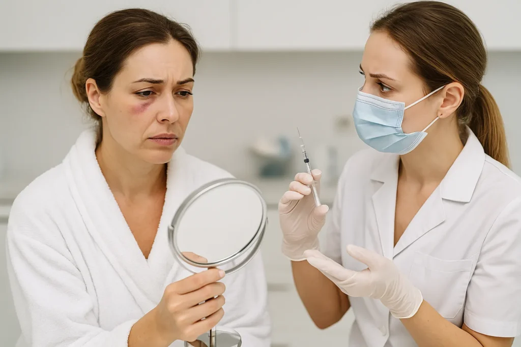 مضاعفات نادرة وخطيرة: انسداد الأوعية الدموية (نخر الأنسجة أو العمى)، عدوى جلدية، أو هجرة الفيلر من مكانه، وتتطلب تدخلاً طبياً فورياً.